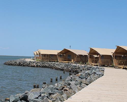 This waterfront glamping resort is located on quaint Chincoteague Island along Virginia's Eastern Shore. The air-conditioned tents feature a bedroom with a queen-size bed; sleeping area with twin bunk beds; private bathroom with shower; kitchenette including mini fridge, microwave, and stovetop; dining area; furnished covered porch; picnic table; and Wi-Fi. Pets are not permitted. Golf cart rentals are recommended because units are not accessible by personal vehicle. The property offers a half-mile of shoreline with a private fishing pier and boardwalk, swimming pool, sports court, playground, and community fire pits with Adirondack chairs.